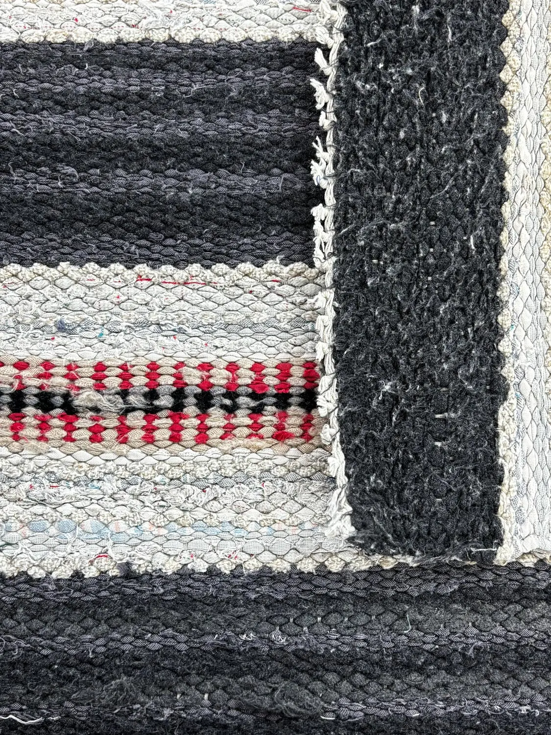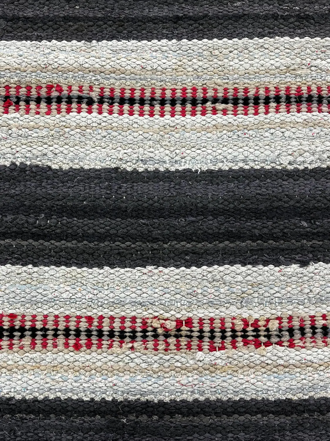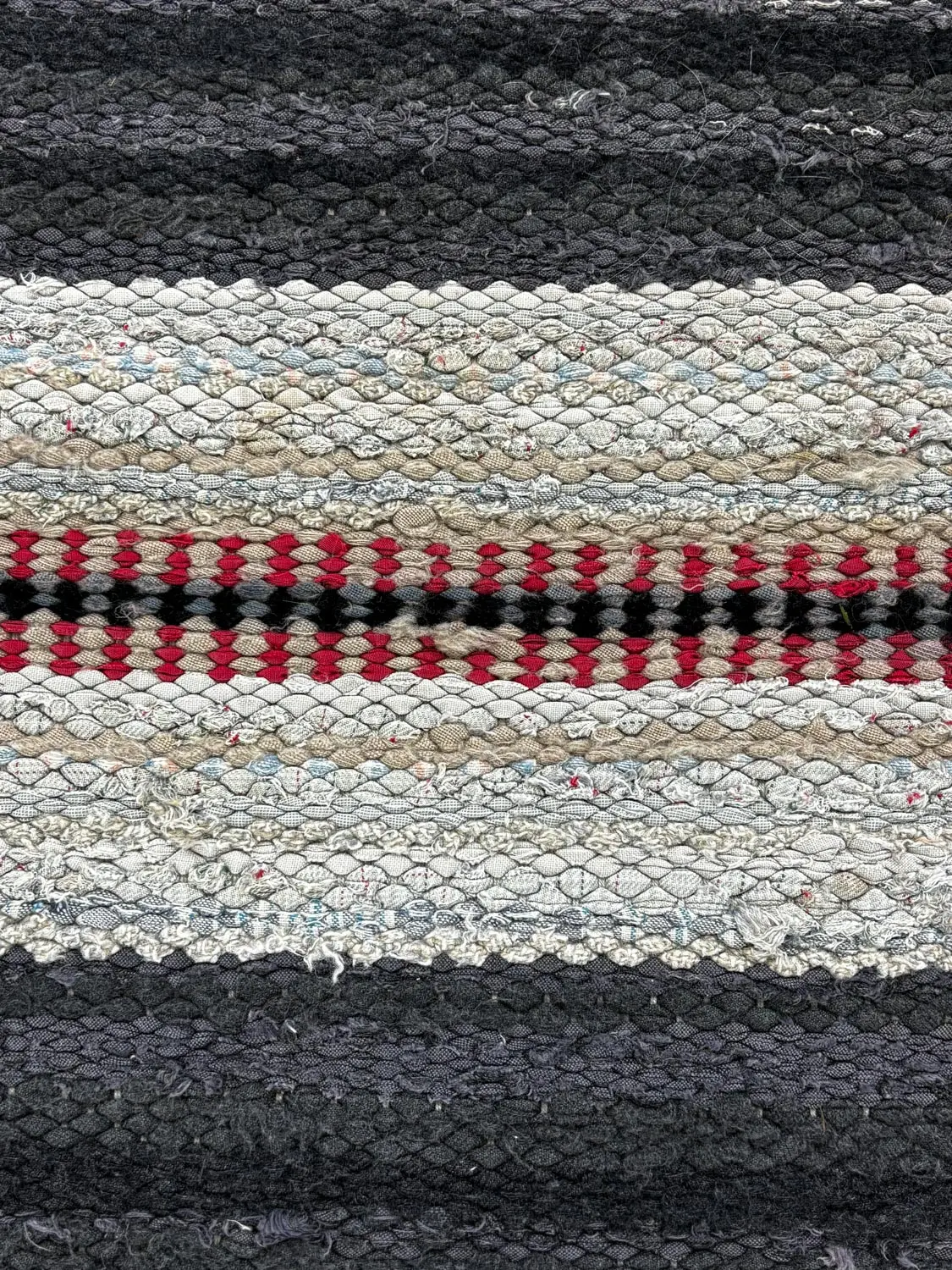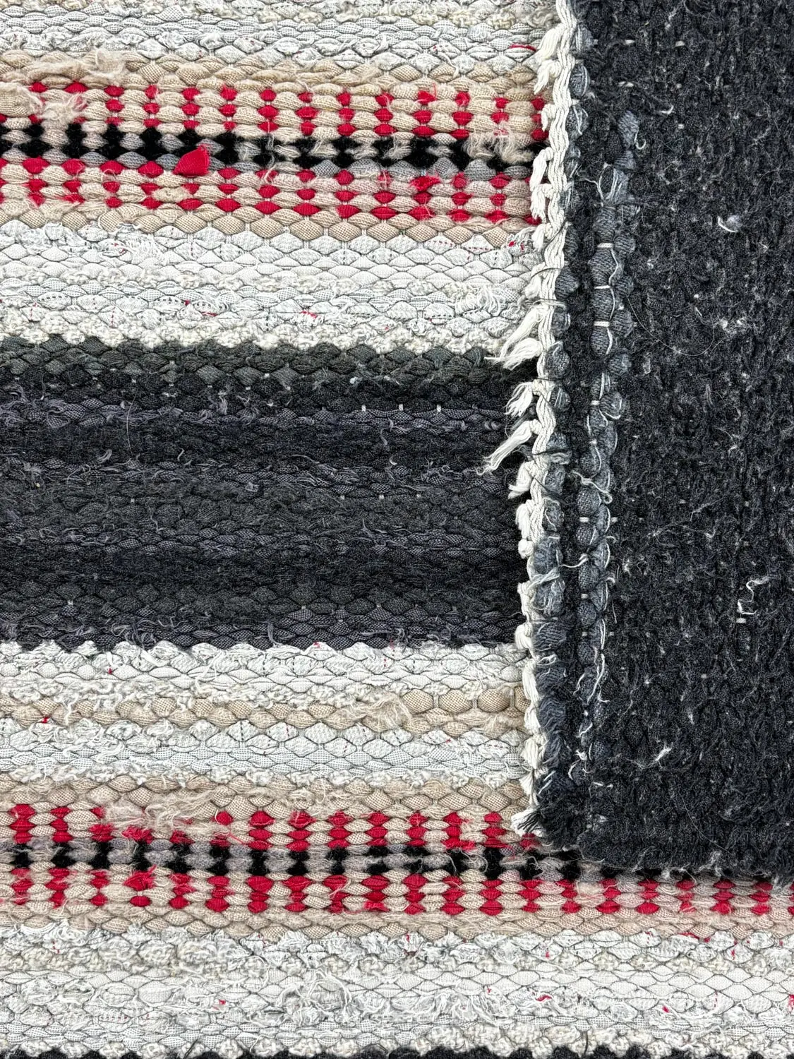 Beautiful black and white striped rag rug with lovely details in a red pattern. Good condition.