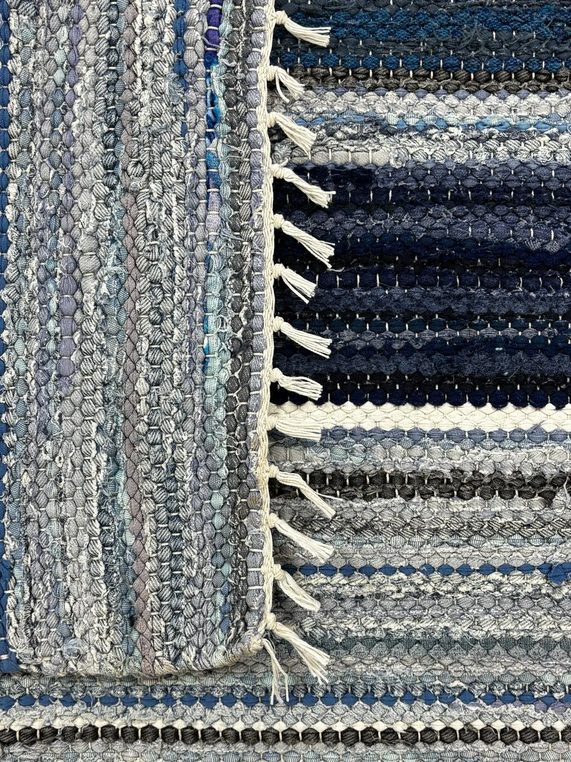 Lovely blue shades in this well woven striped rag rug. Sharp edges and really good condition.