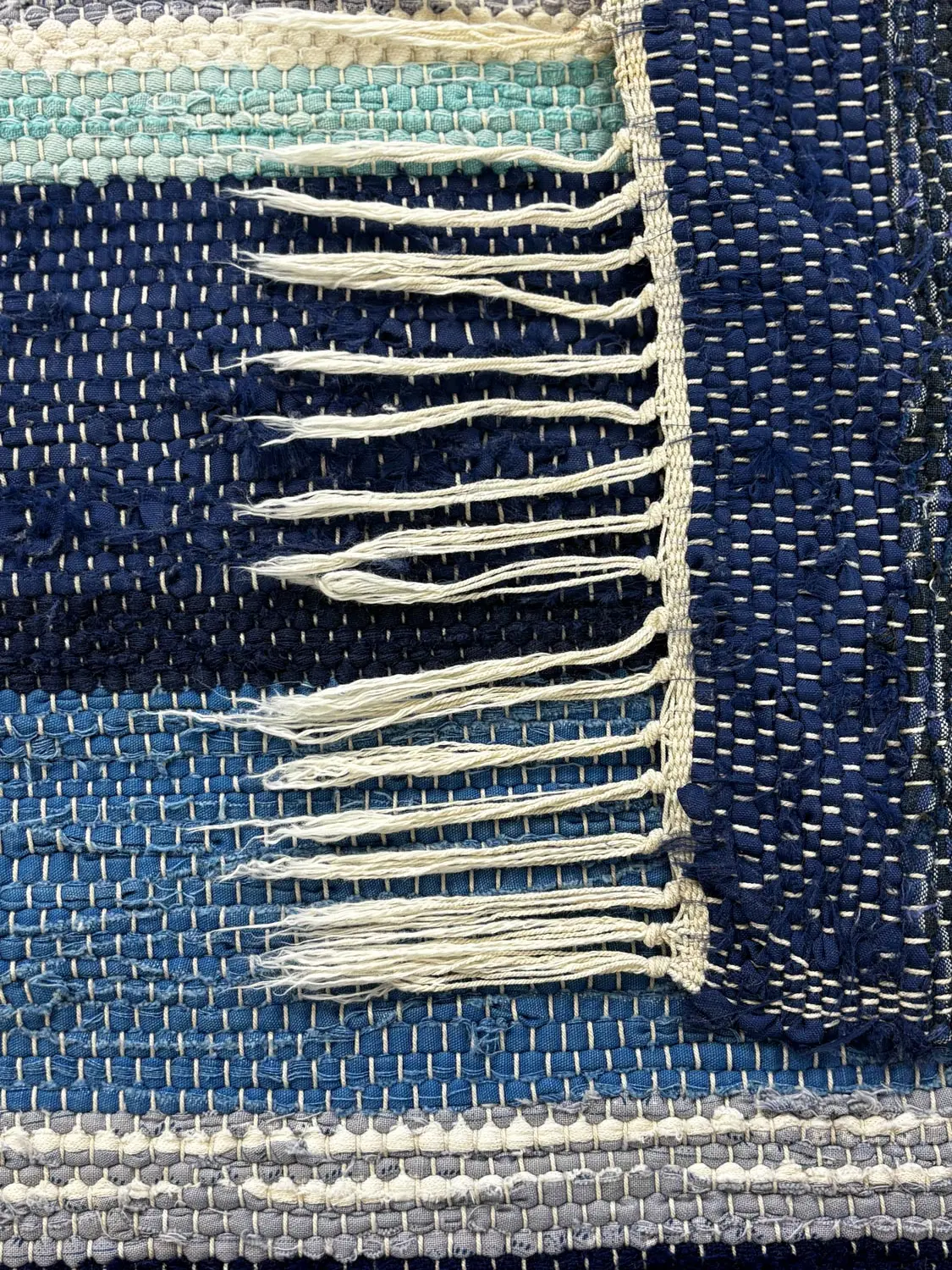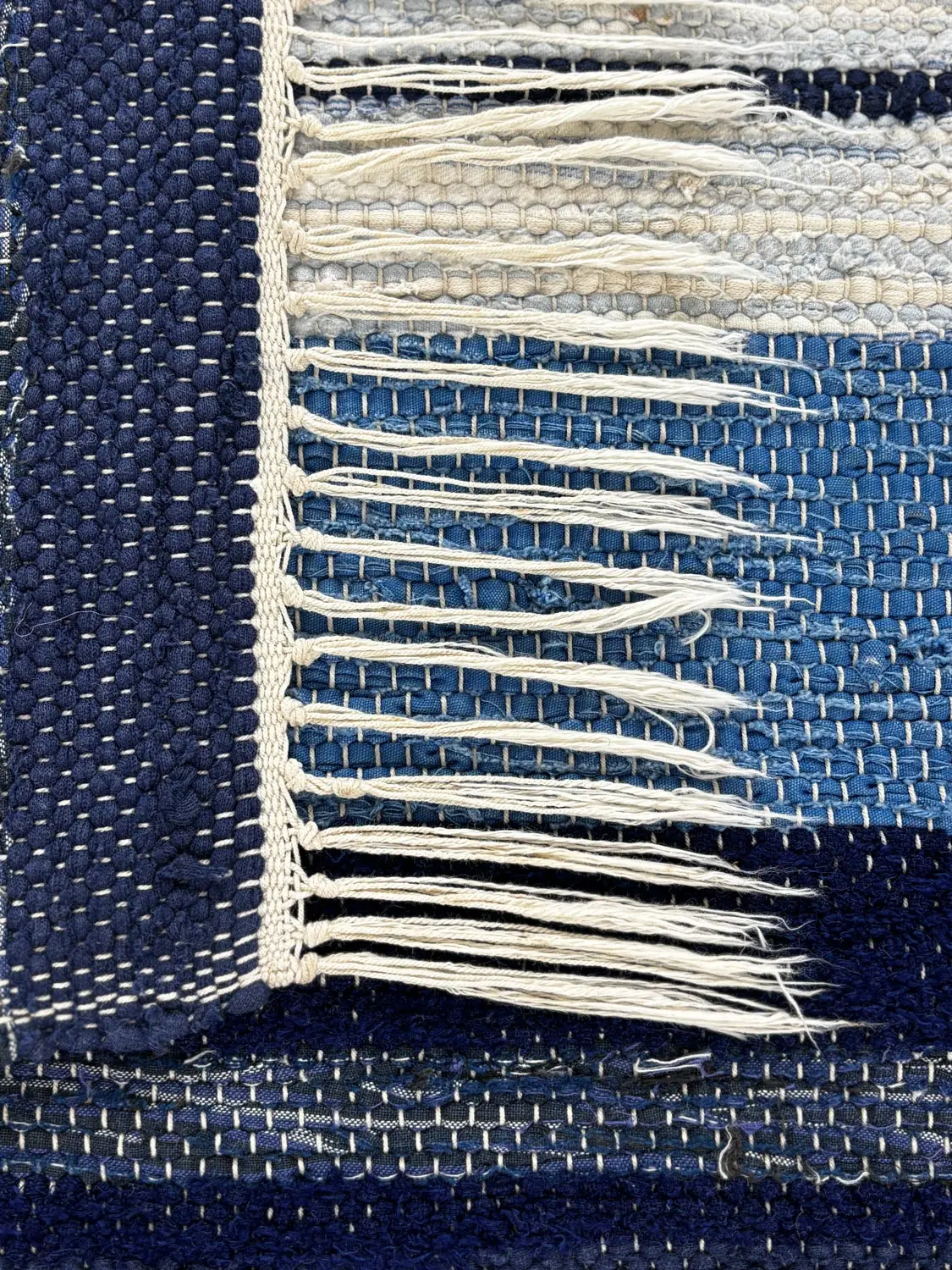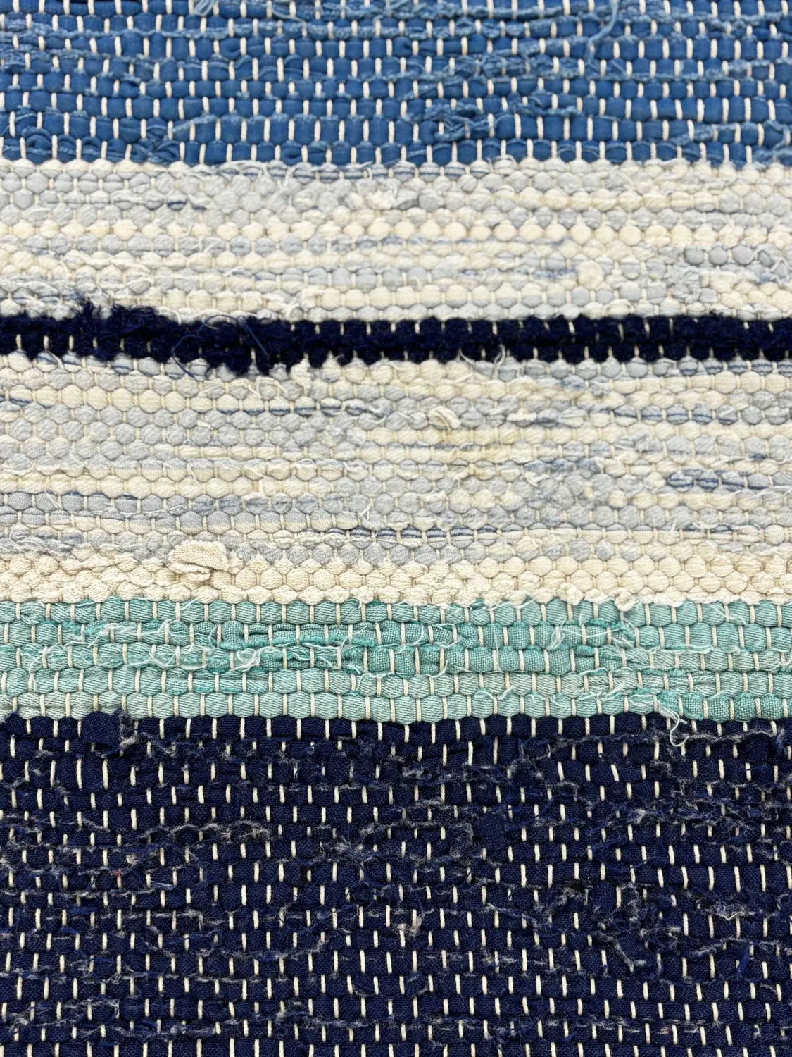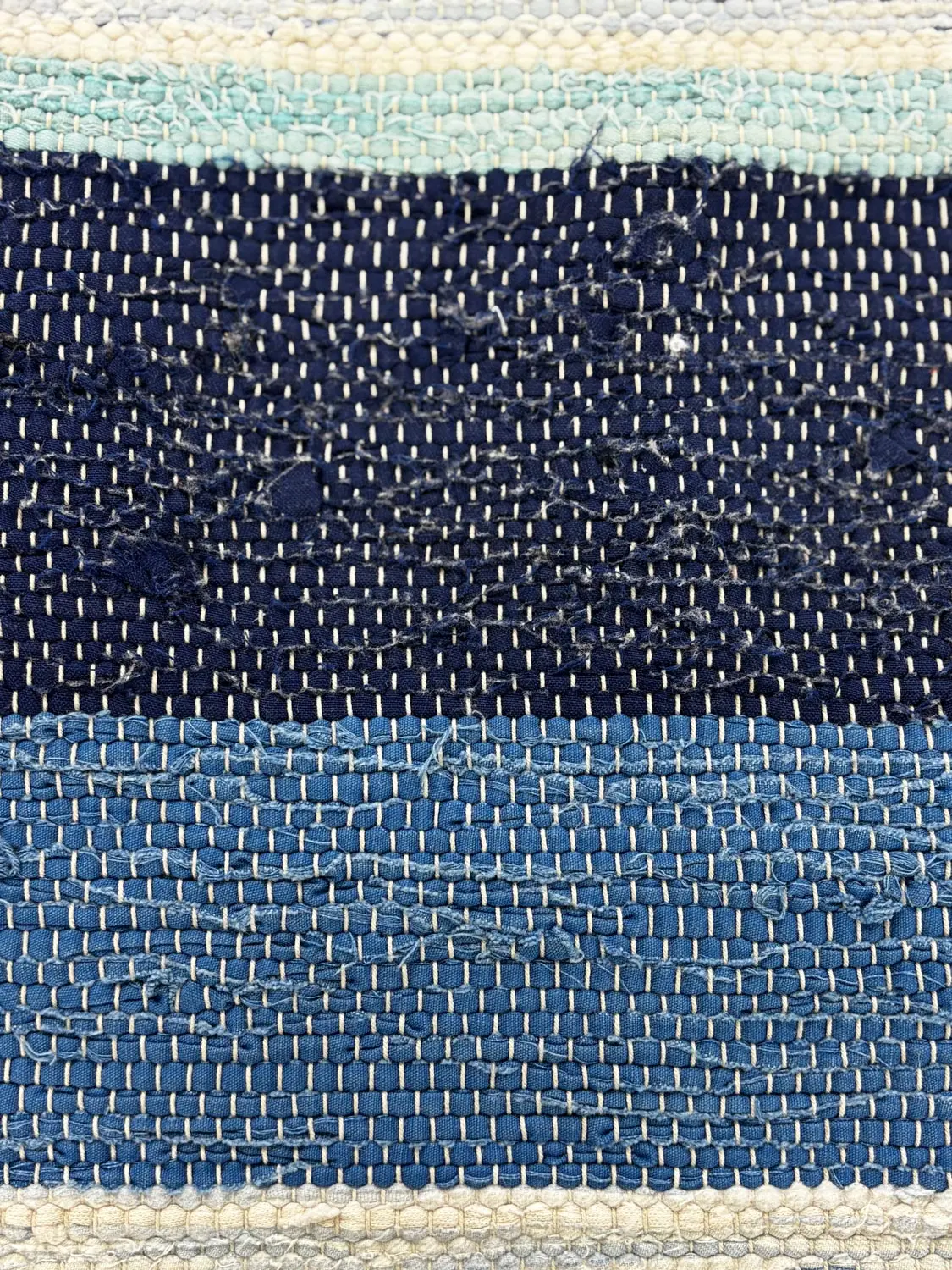 Beautiful blue tones in this traditional striped rag rug. Good condition.