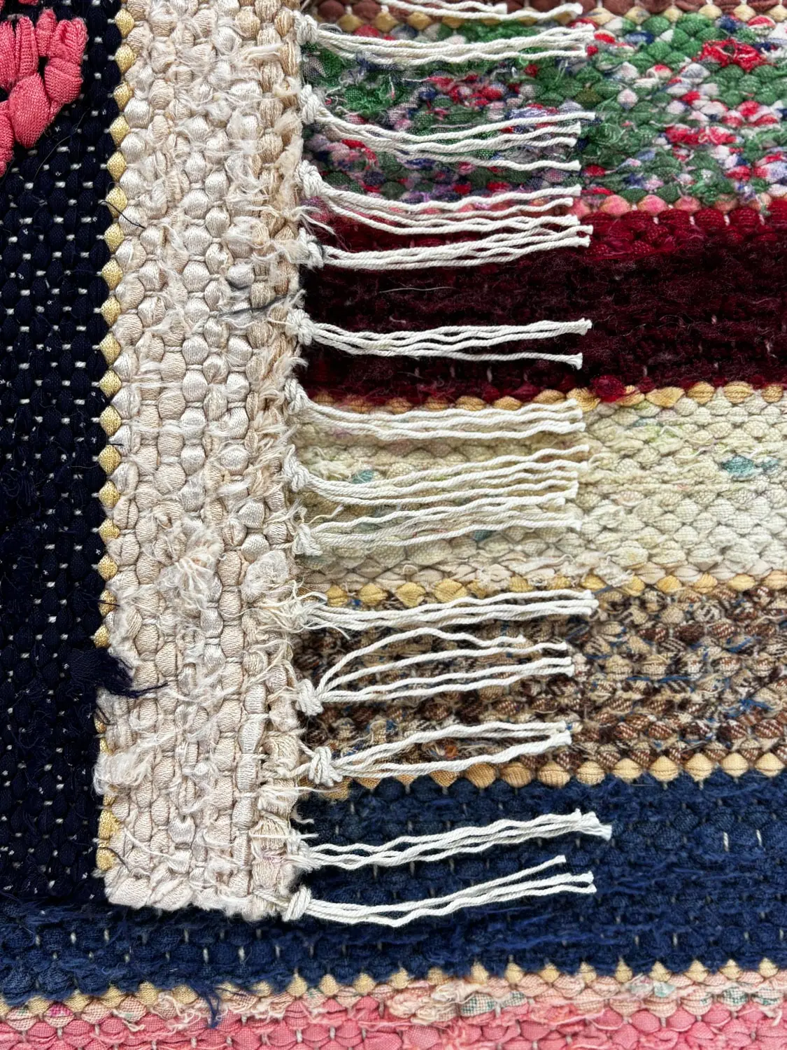 Bright happy colors in this thin well-woven rag rug. Beautiful pattern on the edges. Carefully used, good condition.