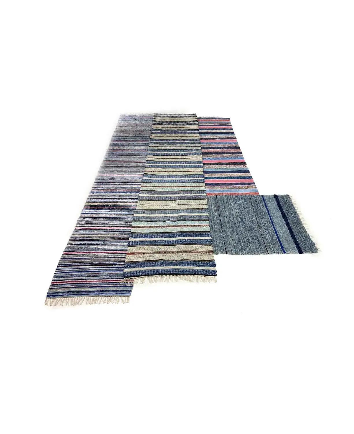 A lovely patchwork of 4 wellwoven rag rugs. Striped pattern in lovely soft blue and pink shades. Patchwork rag rugs a lovely way of bringing history into modern homes.