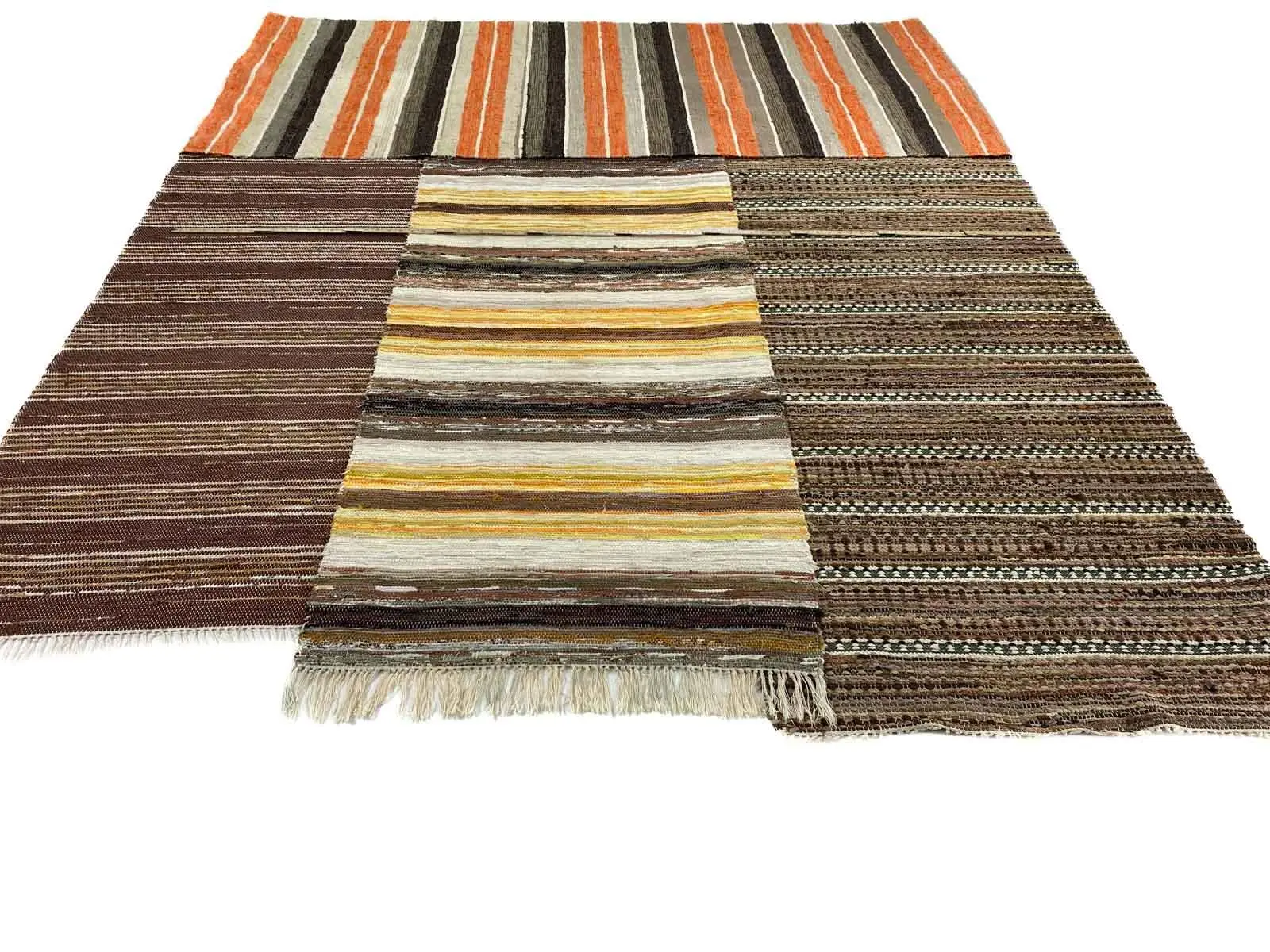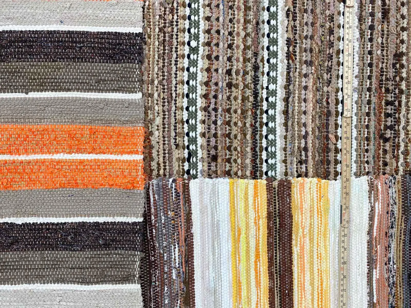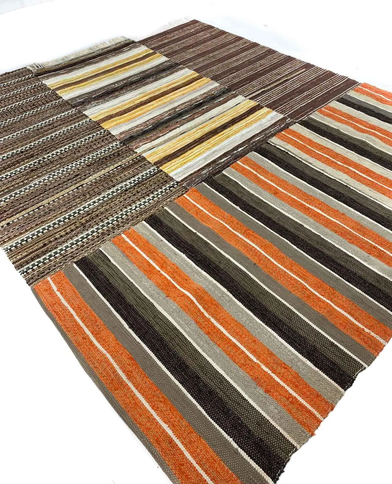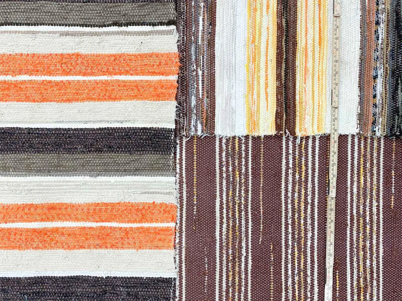 A lovely patchwork of 4 wellwoven rag rugs. Striped pattern in lovely shades of brown, yellow and orange. Patchwork rag rugs a lovely way of bringing history into modern homes.