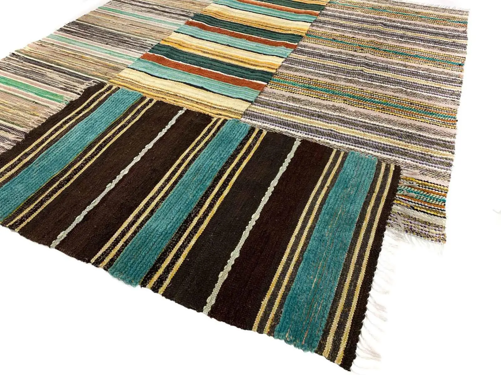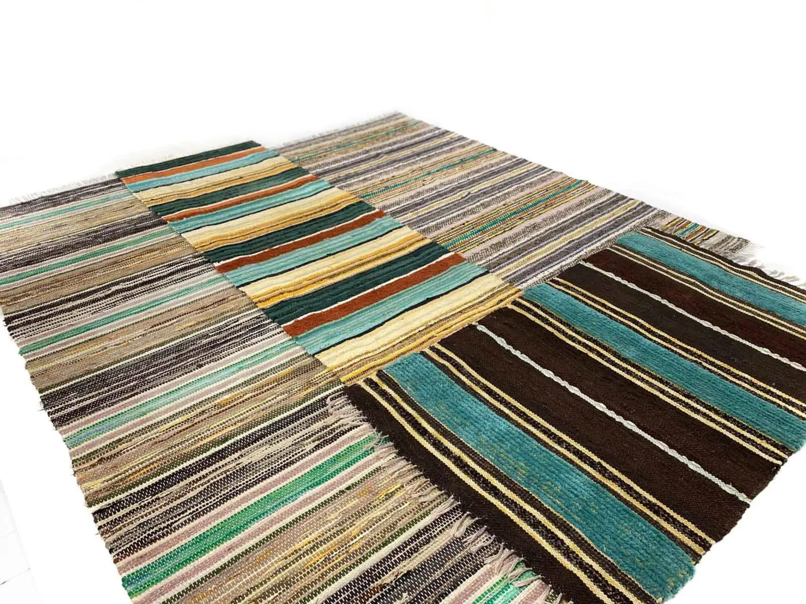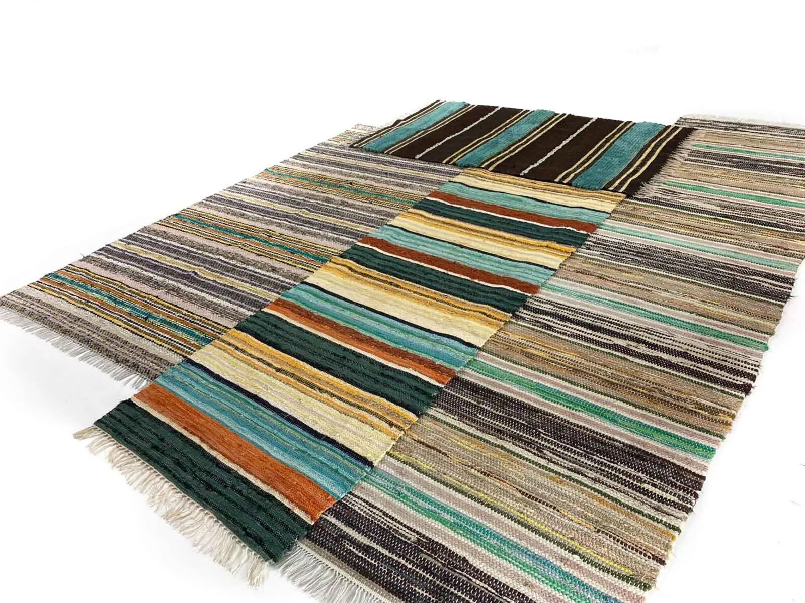 A lovely patchwork of 4 wellwoven rag rugs. Striped pattern in lovely shades of brown, yellow and green. Patchwork rag rugs a lovely way of bringing history into modern homes.