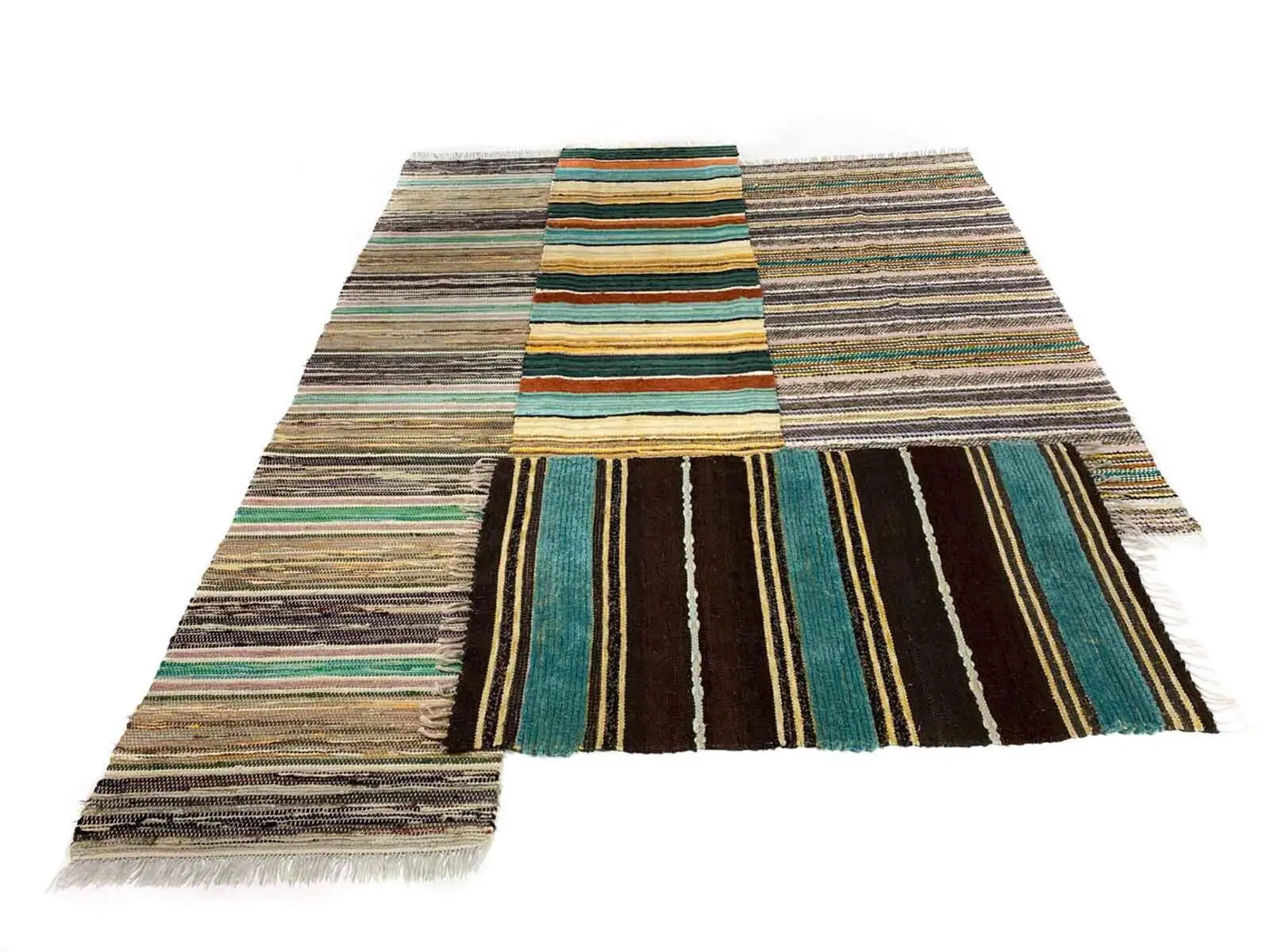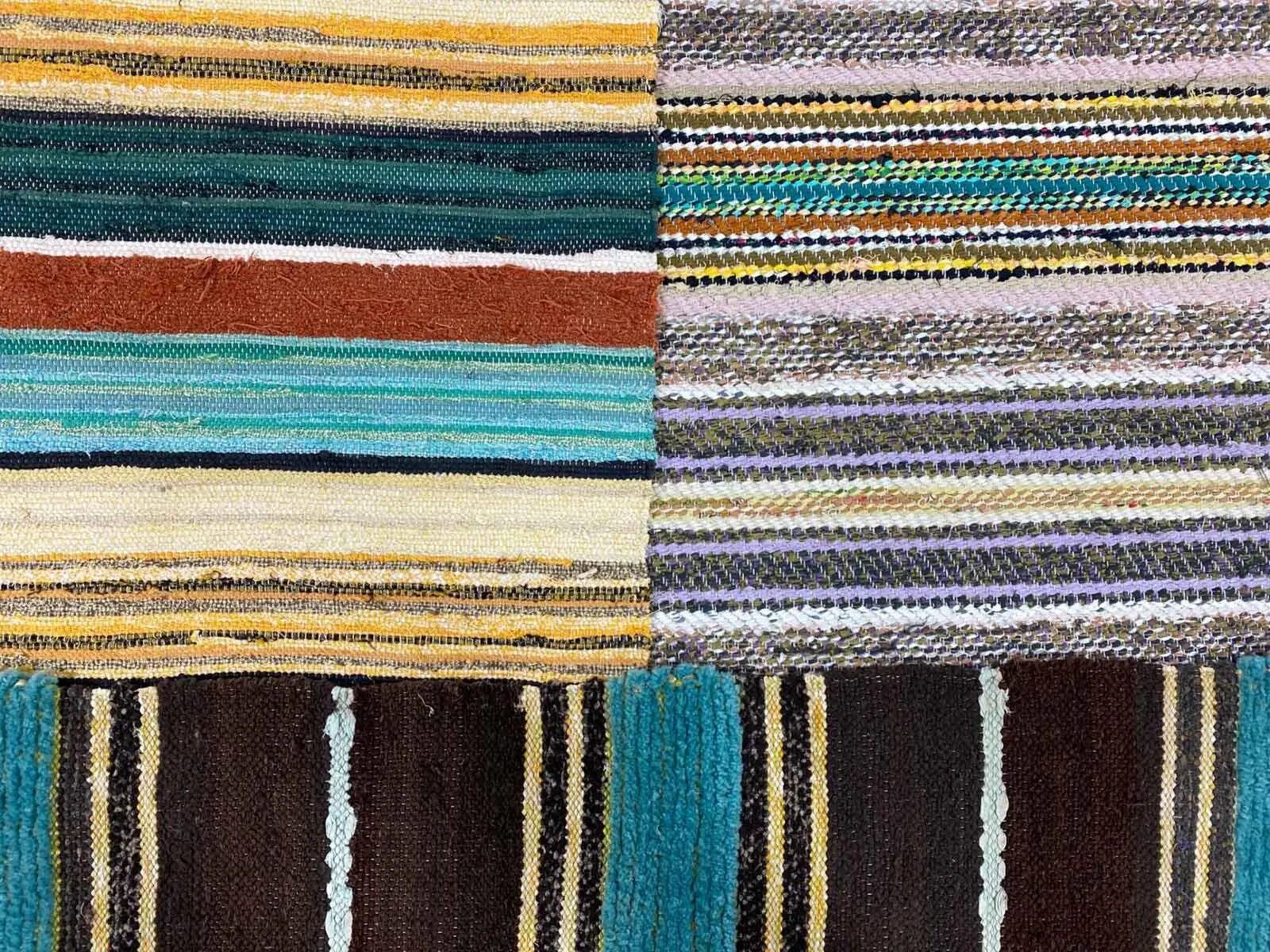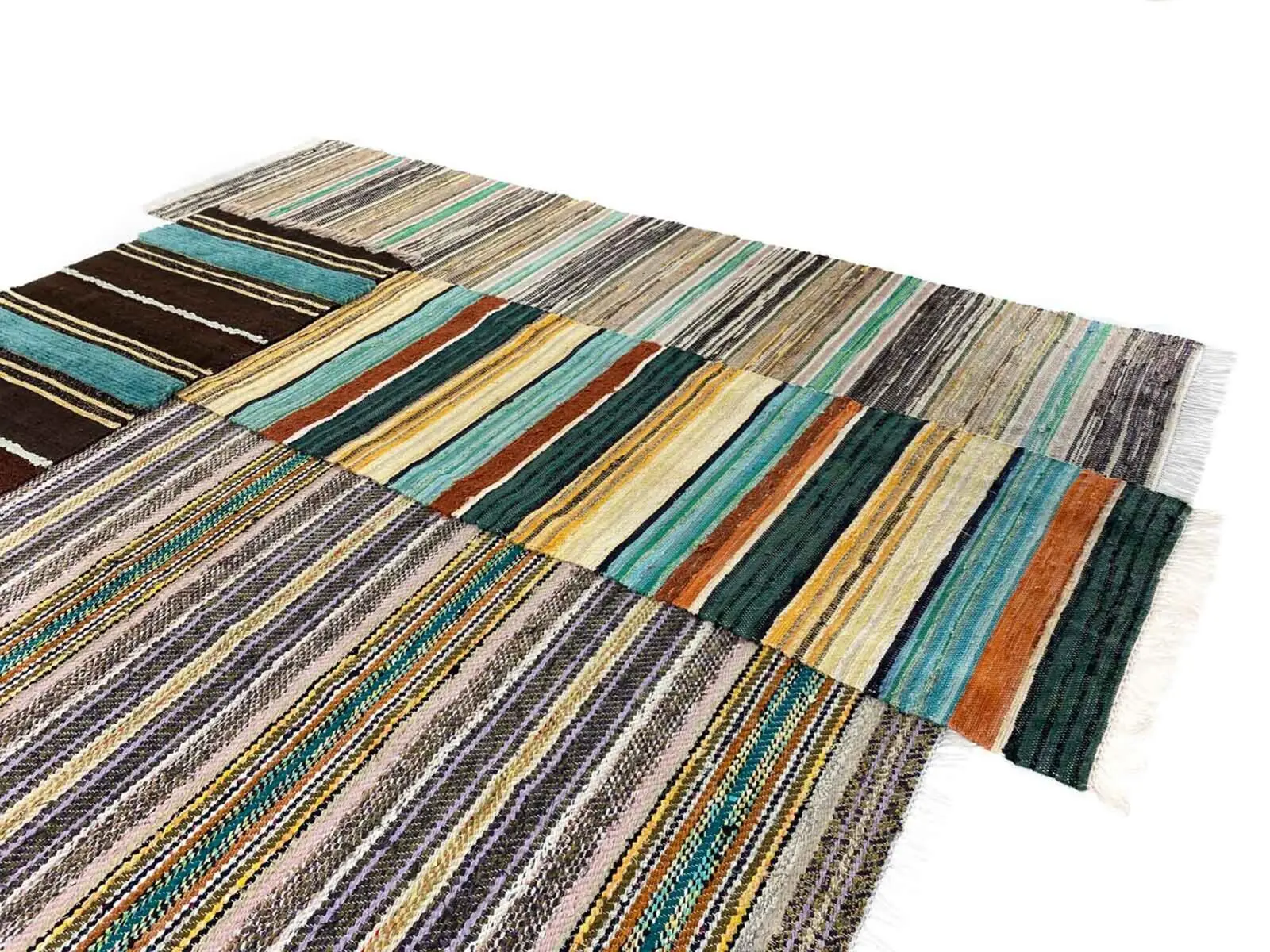A lovely patchwork of 4 wellwoven rag rugs. Striped pattern in lovely shades of brown, yellow and green. Patchwork rag rugs a lovely way of bringing history into modern homes.
