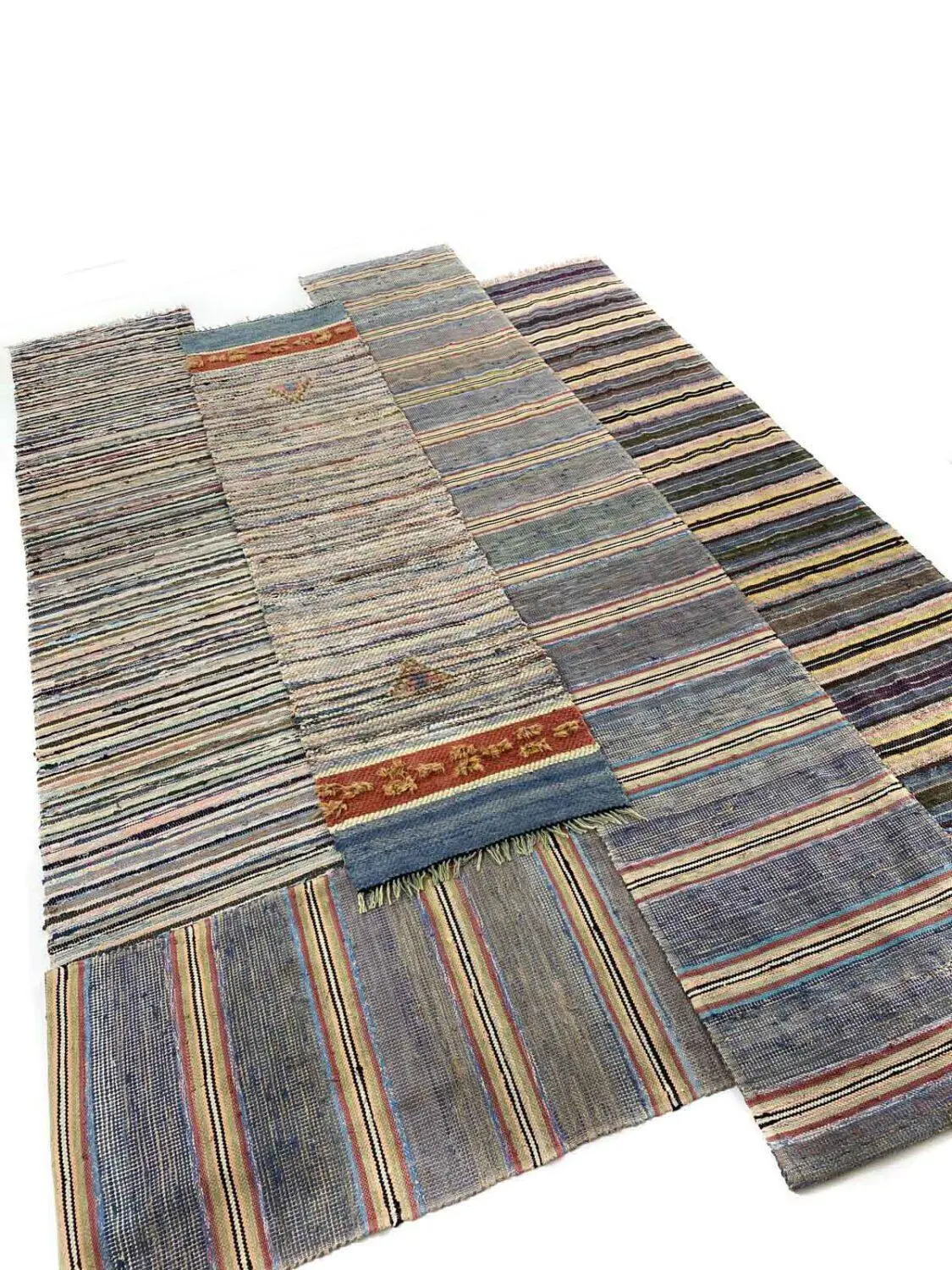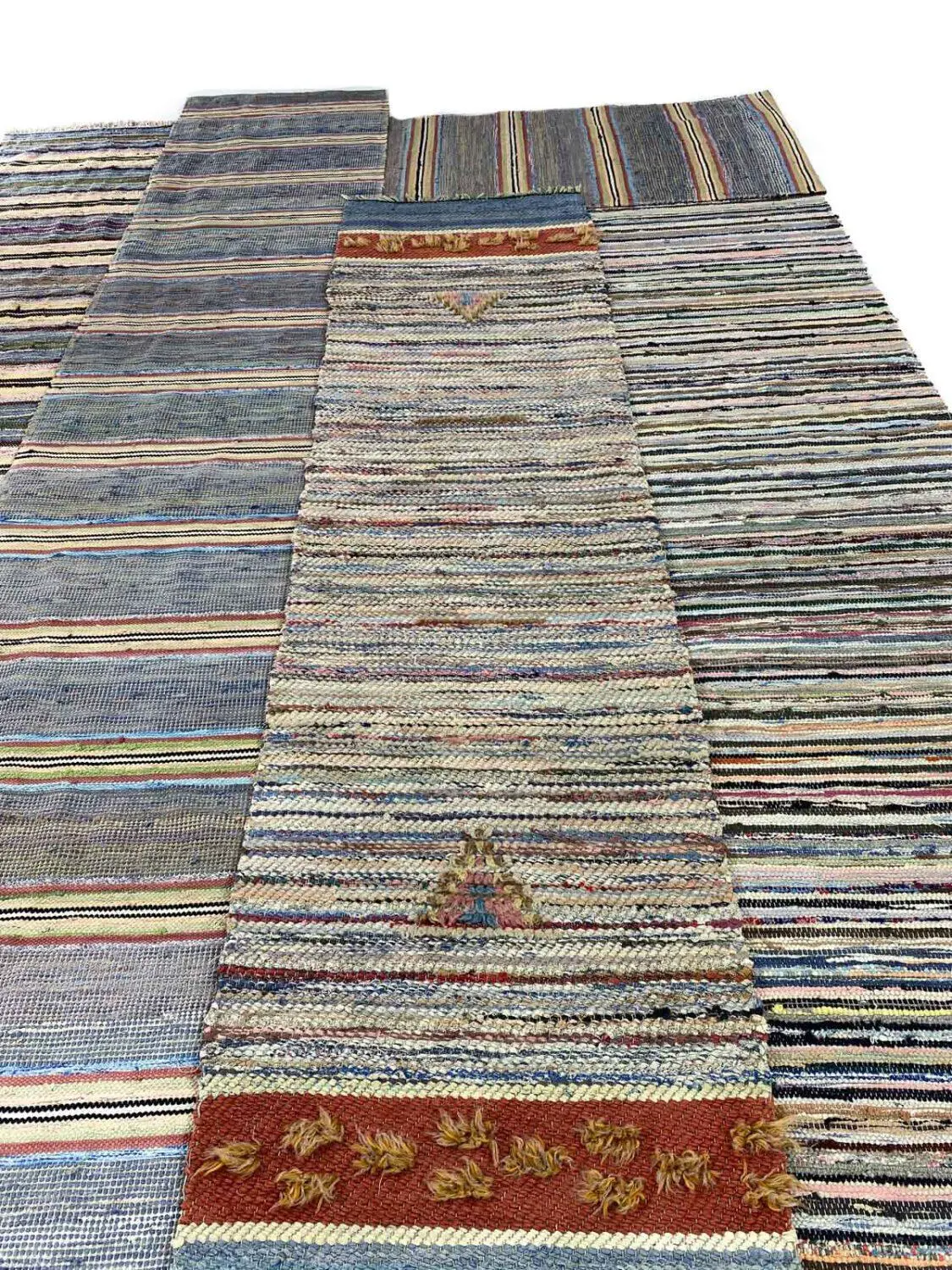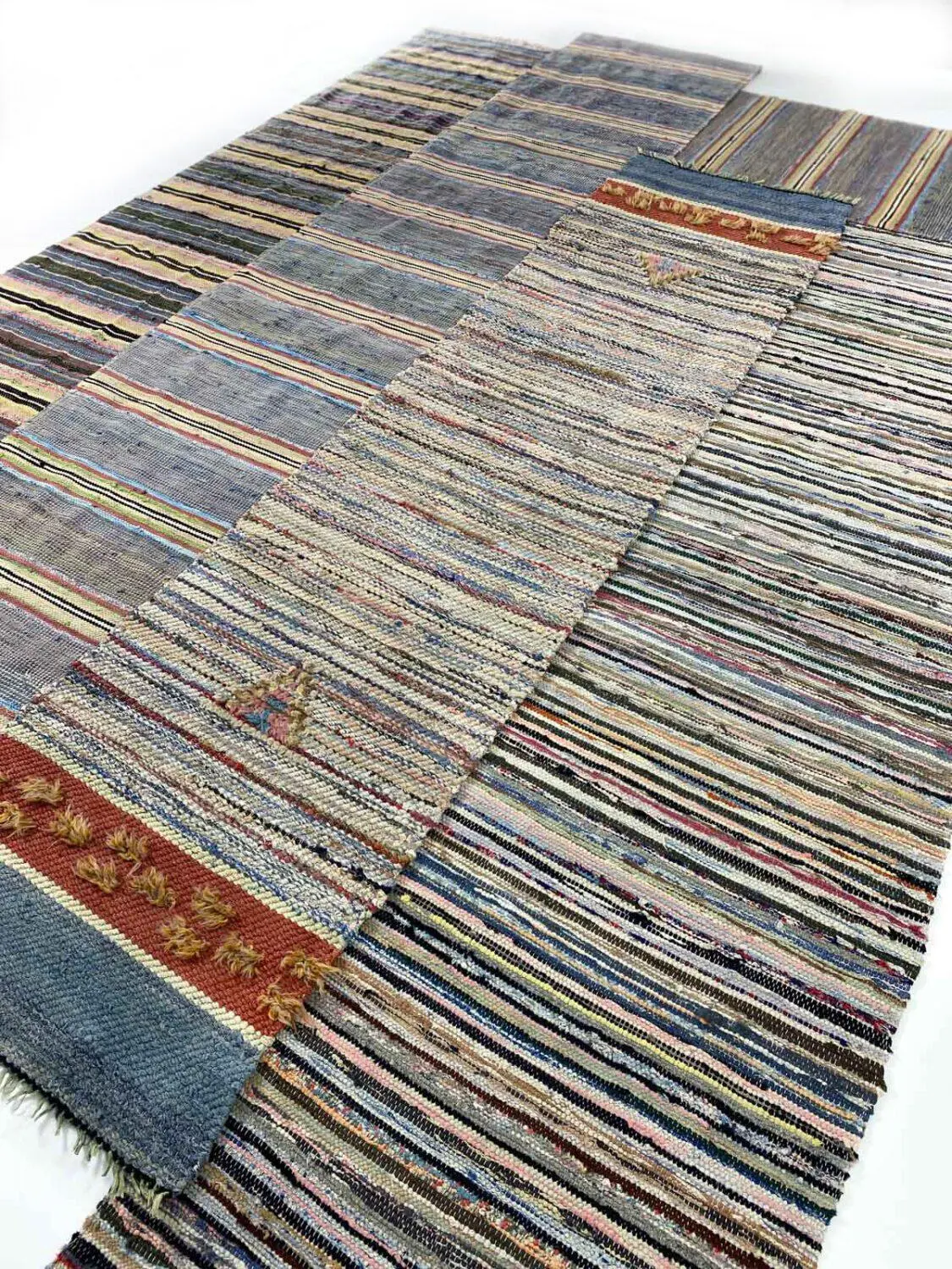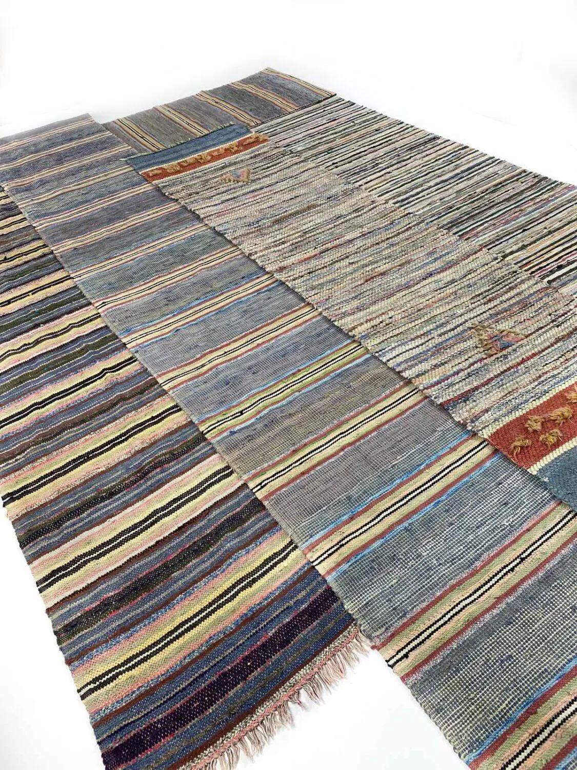 A lovely patchwork of 5 wellwoven rag rugs. Striped beautiful pattern in lovely soft blue and pink shades. The rag rug with the unique pattern is made by Jenny Andersson from Småland in the late 1950´s. Patchwork rag rugs a lovely way of bringing history into modern homes.