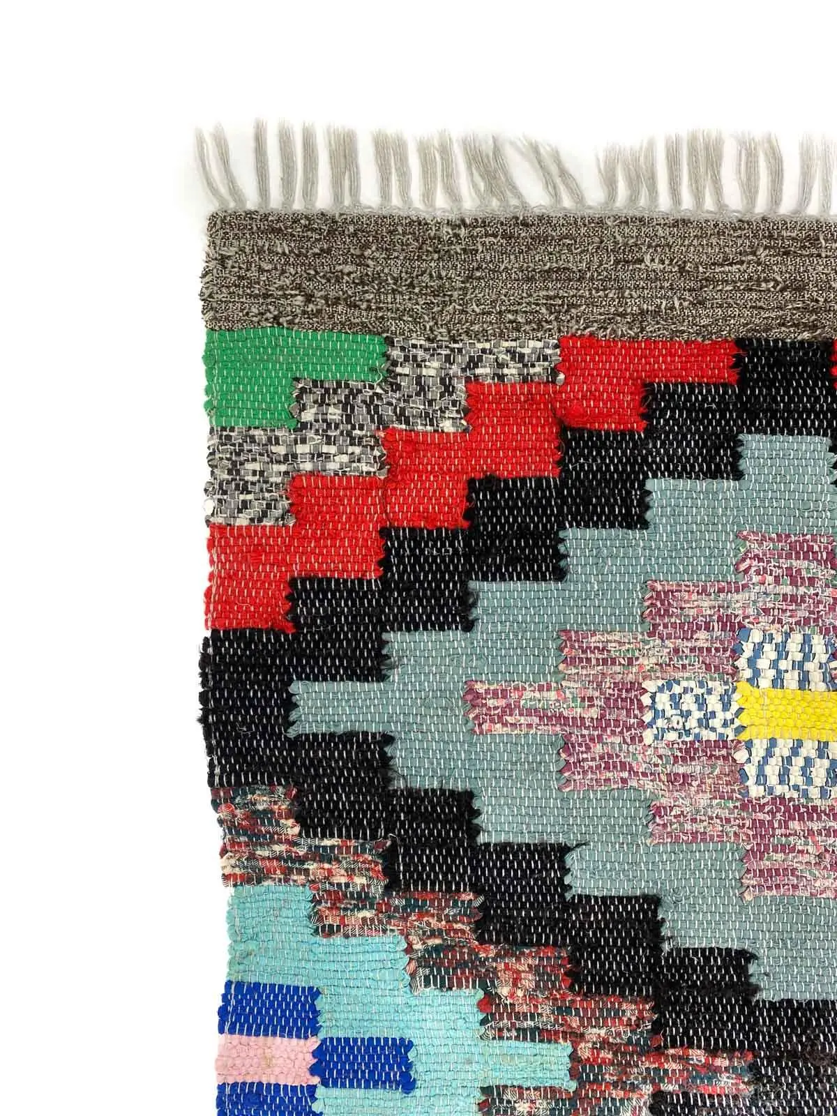 Woven by Märta Johansson. Born 1912, lived in Malmbäck outside Nässjö. Cool pattern in clear colors in this cool rug rug. A piece of art. Hardly used, very good condition!